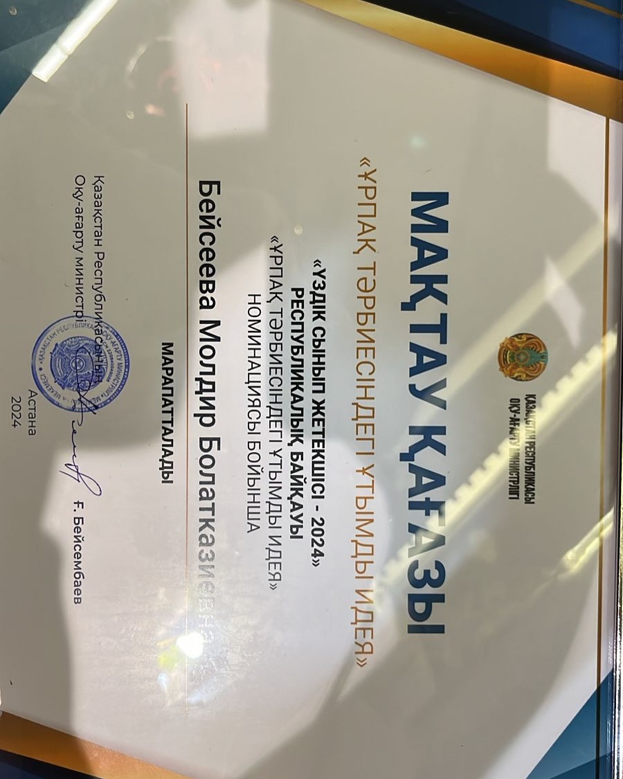 Учитель русского языка и 9 «а» классный руководитель-Бейсеева Молдир Болатказиевна, принявшая участие в республиканском конкурсе ”Лучший классный руководитель – 2024”, организованном Министерством просвещения Республики Казахстан в сентябре, награждена номинацией “рациональная идея в воспитании поколений”. От всей души поздравляем нашего учителя, прославившего нашу школу! 🏆Данный классный руководитель занял 1 место в конкурсе “Лучший классный руководитель-2024”, проводимом по городу Шымкент.